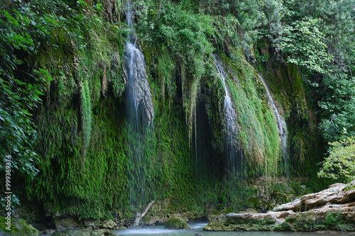 © Dmitry, Fototapeta premium A waterfall trickles down the overgrown rocky slopes of a mountain