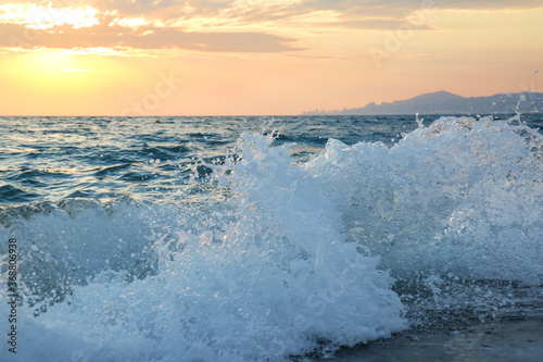 © Voladora, Obraz premium a wave breaks on the shore at sunset