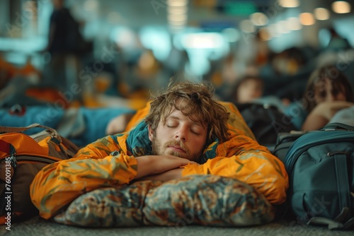 Obraz premium A weary young traveler is fast asleep in an airport lounge, surrounded by his...