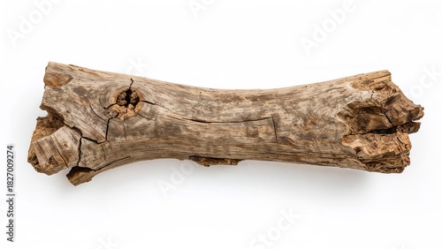 © Lasvu, Naklejka premium A weathered and aged piece of wood, resembling a log or driftwood, with a hollow and cracks, placed on a white background.