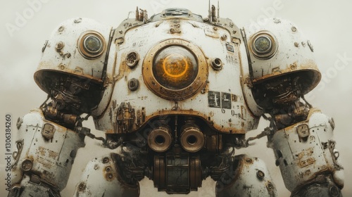 © HeriAfrilianto, Fototapeta premium A weathered and detailed mechanical robot stands facing forward