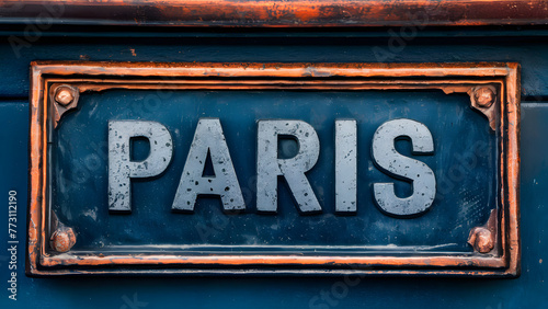 © Jérôme , Fototapeta premium A weathered and rusty metal plate with the word “PARIS” embossed on it.