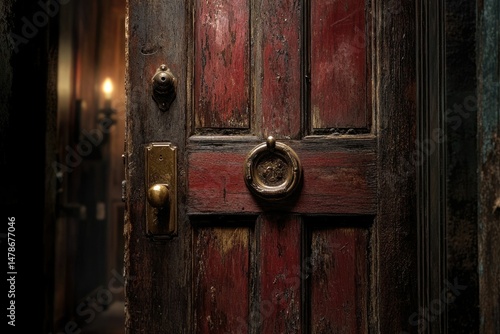 Fototapeta premium A weathered, antique door with brass hardware stands ajar, revealing a dimly...