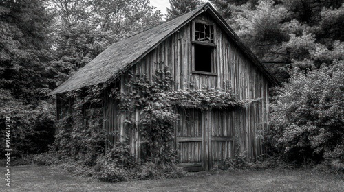 © BerkahStock, Obraz premium A weathered barn overgrown with vines in a forested area, evoking a sense of decay and nature.