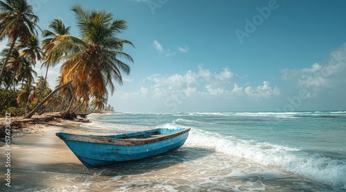 Fototapeta premium A weathered blue boat rests on a pristine sandy beach, nestled beneath the shade of leaning palm trees against a backdrop of a vibrant turquoise ocean and a clear sky
