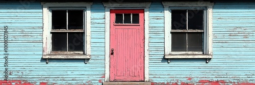 © Vibrant Visions Pixe, Fototapeta premium A weathered blue wooden exterior with two windows and a single bright pink door The house shows signs of aging with peeling paint and chipped wood