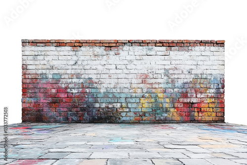 © Jawad, Naklejka premium A Weathered Brick Wall, A Canvas Of Faded Graffiti, Tells Stories Of Forgotten Art And Urban Resilience Against A Simple, Stone-paved Ground Isolated on Transparent Background