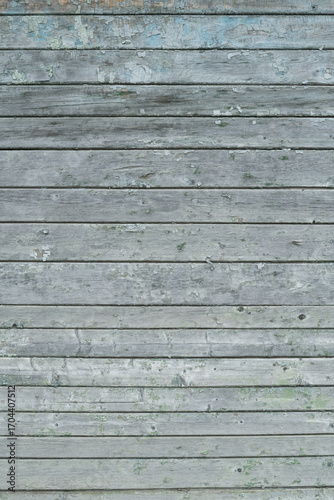 © Dmytro, Obraz premium A weathered gray wooden wall with horizontal planks and peeling paint