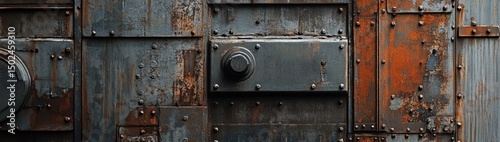 © HauraStd, Fototapeta premium A weathered metal surface with a circular detail and a rectangular panel