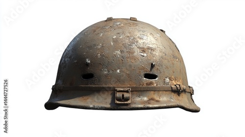 © Olsek, Obraz premium A weathered military helmet showcasing history and battle scars. This vintage piece symbolizes resilience and courage in the face of adversity. Generative AI