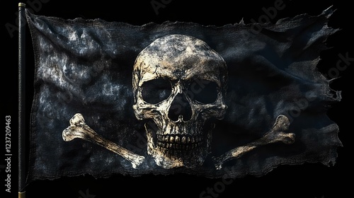 Naklejka premium A weathered pirate flag featuring a skull and crossbones design. Ideal for nautical themes and adventure concepts.