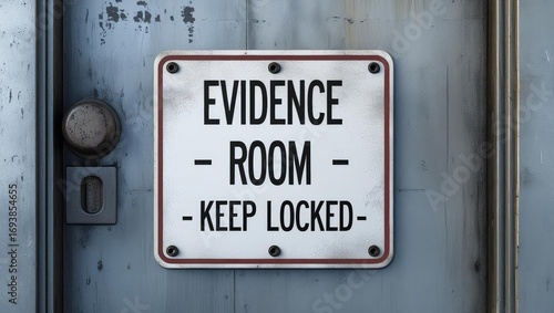 Fototapeta premium A weathered sign on a locked door indicating an evidence room, emphasizing...