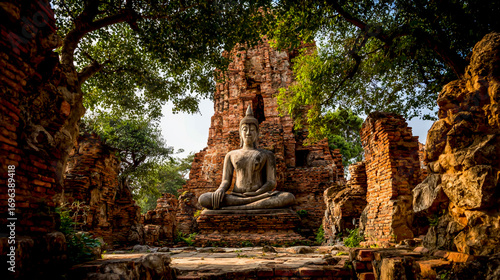 Naklejka premium A weathered statue of Buddha, sitting in the ruins of Ayutthaya's Lelyoang Temple