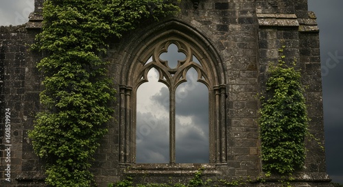Fototapeta premium A weathered stone archway window, overgrown with greenery, revealing a cloudy...