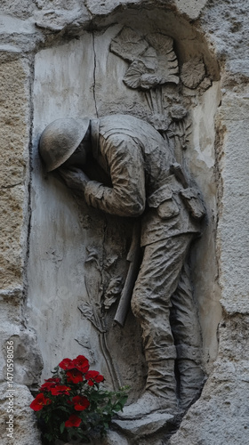 Fototapeta premium A weathered stone relief sculpture depicts a soldier in a helmet, hunched over in grief or exhaustion, embedded in a wall. A small offering of red flowers rests at his feet, creating a poignant memori