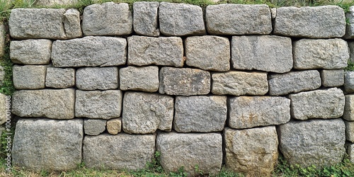 © Vibrant Visions Pixe, Fototapeta premium A weathered stone wall constructed with irregular shaped, gray granite blocks, exhibiting a rustic and natural texture.
