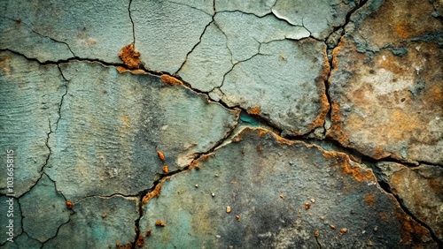© Kukar Studio, Obraz premium A weathered surface with deep cracks reveals layers of time, rust, and subtle hints of turquoise