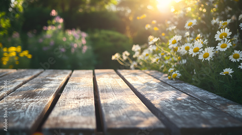 © Volkan, Fototapeta premium A weathered teak outdoor table surrounded by wildflowers captured in natural morning light.