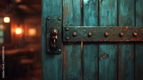 Fototapeta premium A weathered, teal-painted wooden door opens to a dimly lit interior