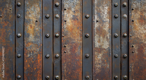 © Easy, Fototapeta premium A weathered wall constructed from horizontal metal panels showcases an array of rust and wear, featuring visible rivets and unique textures that illustrate its age and exposure to elements