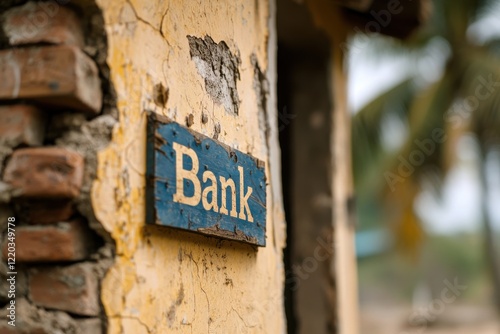 © Nopadon, Fototapeta premium A weathered wall features a vintage blue "Bank" sign, emphasizing a bygone era and rustic charm amidst natural surroundings.