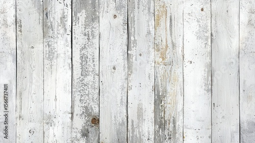 Obraz premium A weathered, white-painted wooden plank wall with a rustic, vintage aesthetic.