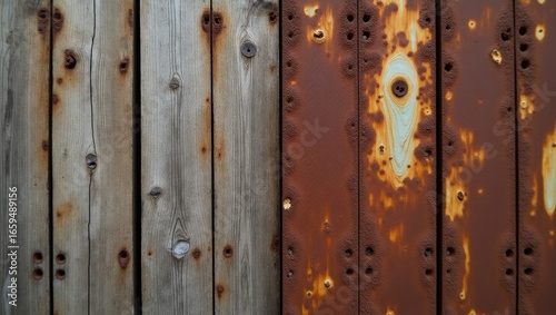 © CetakUndangan, Fototapeta premium A weathered wooden and rusted metal surface, showcasing contrasting textures and colors.