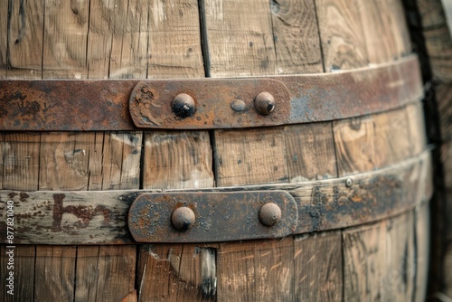 Fototapeta premium A weathered wooden barrel worn smooth by years of use in a forgotten winery,...
