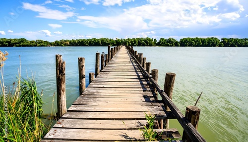 © Heni, Fototapeta premium A weathered wooden bridge stretches across a serene lake under a partly cloudy sky. Tranquil, picturesque