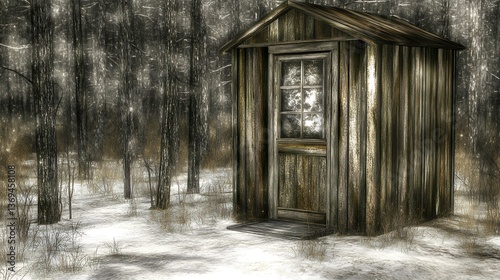 © shopia, Obraz premium A weathered wooden cabin stands alone in a snow covered forest