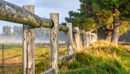 © Lili, Fototapeta premium A weathered wooden fence stretches through a green field on a hazy morning