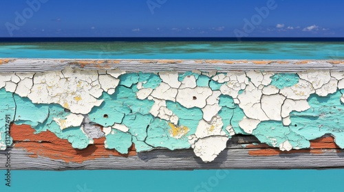 Obraz premium A weathered wooden fence with peeling paint and a view of the ocean.