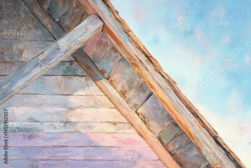 © AlparadiseDesign, Obraz premium A weathered wooden gable roof under a pastel sky.