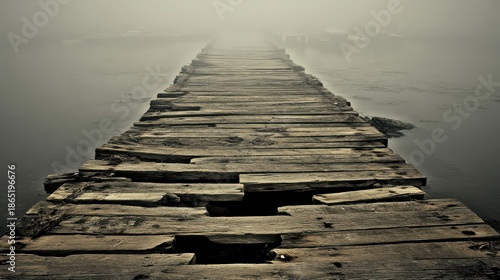 © Fauzerene, Obraz premium A weathered wooden pier decaying into the misty, still water