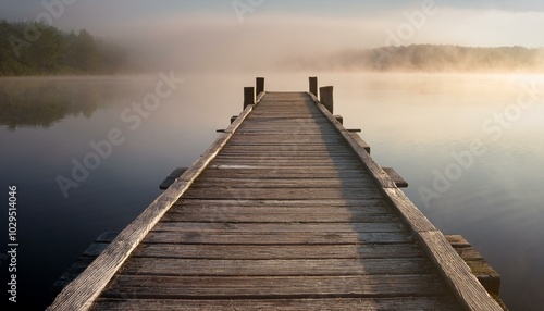 Fototapeta premium A weathered wooden pier extending into a calm misty lake, with soft light reflecting off the