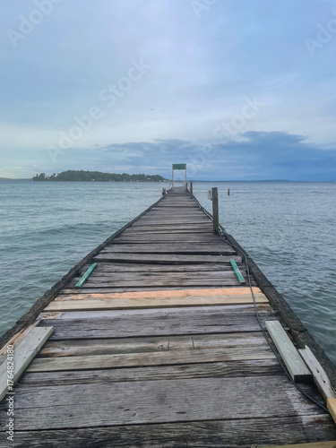 © Rawf8, Fototapeta premium A weathered wooden pier stretches into the calm Caribbean Sea near Bocas del Toro, Panama. Cloudy blue sky