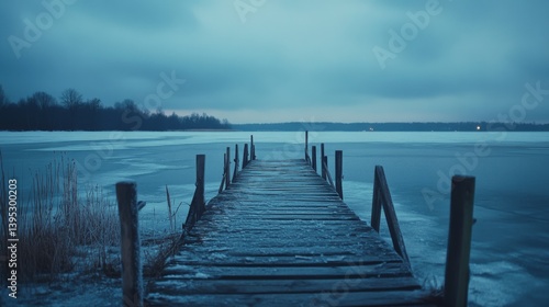 © VK Studio, Fototapeta premium A weathered wooden pier stretches into the expansive, tranquil lake beneath a moody, blue-hued sky, evoking feelings of solitude.