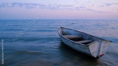 Naklejka premium A weathered wooden rowboat rests gently in the calm, twilight waters of a serene lake, the sky painted with soft purple hues. : Generative AI