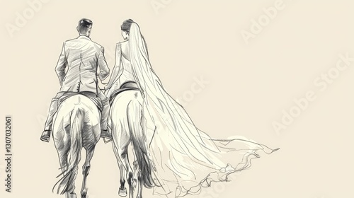 © Екатерина Канунников, Obraz premium A wedding drawing of the bride and groom riding on horseback, with a white background, simple lines, and a minimalistic, sketch-like style