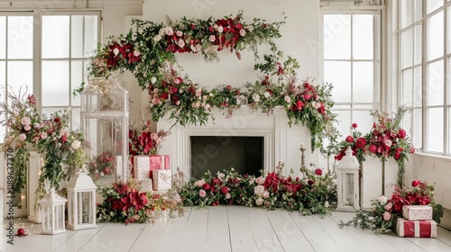 Fototapeta premium A welcoming Christmas backdrop featuring a warm fireplace, festive garlands,...
