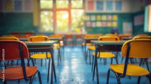 Fototapeta premium A well-lit classroom with empty desks and chairs awaiting students and lessons.