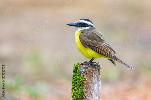 Naklejka premium A well-lit image of a Great Kiskadee bem-te-vi (Pitangus sulphuratus), with selective focus highlighting its vibrant yellow breast. The bird is highlighted against a blurred background. Brazilian Bird