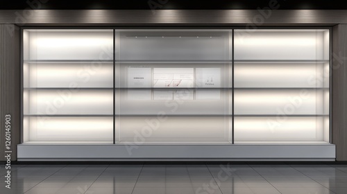 © pinporn manosri, Obraz premium A well-lit modern display shelf with white walls and open space for showcasing products or graphics.