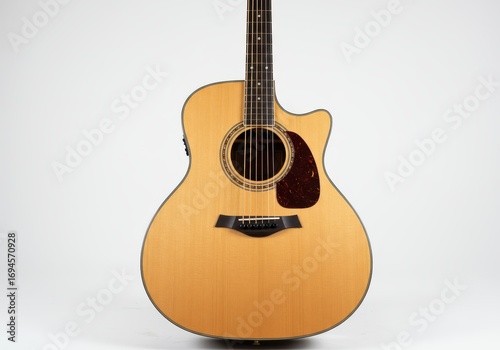© twilight mist, Obraz premium A well-lit, shot of a light-colored acoustic guitar against a plain white backdrop.