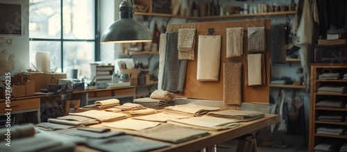 Fototapeta premium A well-lit workshop with a wooden table filled with fabric samples and a...