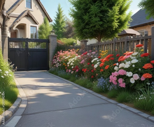 Naklejka premium A well-maintained driveway with a row of neatly arranged flowers and an...
