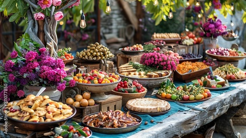 © Sonya, Fototapeta premium A well-organized image featuring a variety of fresh produce arranged on multiple trays, surrounded by a lush green tree