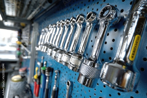 © whitestorm, Fototapeta premium A well-organized set of chrome-plated ratchet wrenches on a blue pegboard.