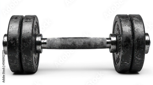Fototapeta premium A well-used, dark grey dumbbell isolated on white background.