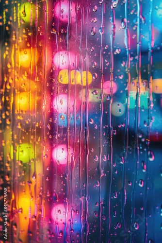 © Fotograf, Obraz premium A wet and rainy day outside, captured through a window with raindrops glistening in the light